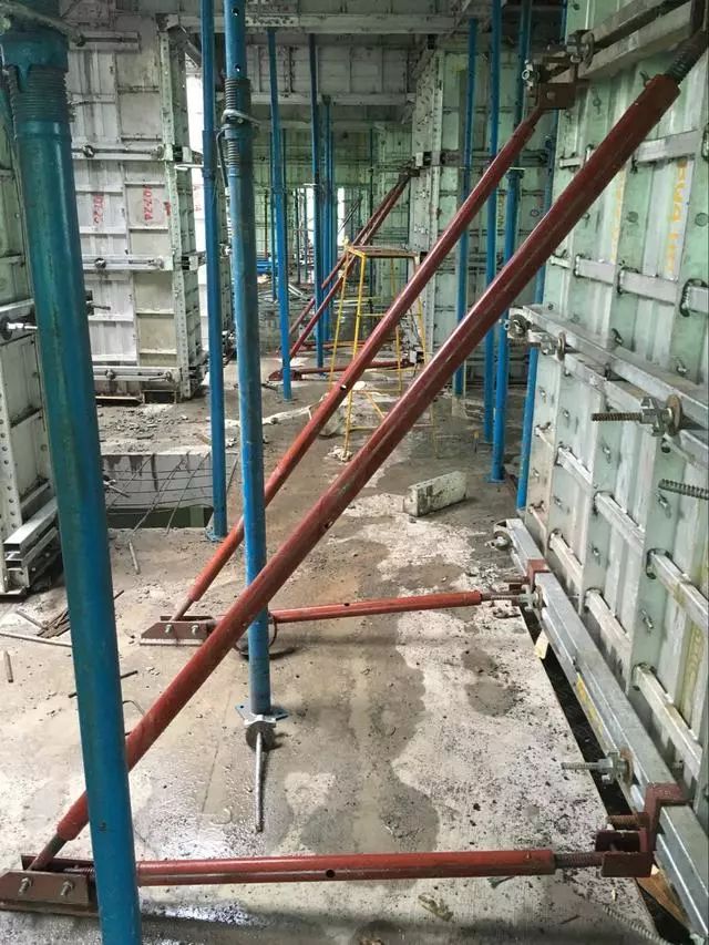 第一道和第三道背楞上加装可调斜撑,用来调整墙面竖向垂直度,采用膨胀螺栓固定在楼板上,稳固,方便。斜撑间距根据墙面长度来定,间距应≤1800mm。