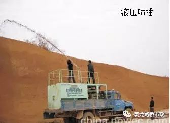 4)液压喷播种子层:将混合种子、粘合剂、肥料、保水剂、木纤维和水等按一定比例配制成的粘性浆体,通过高压,直接喷送至边坡上。喷下的种子泥浆应当具有良好的附着力及明显的颜色,不遗漏、不重复且均匀。