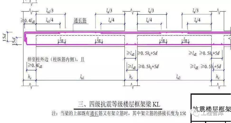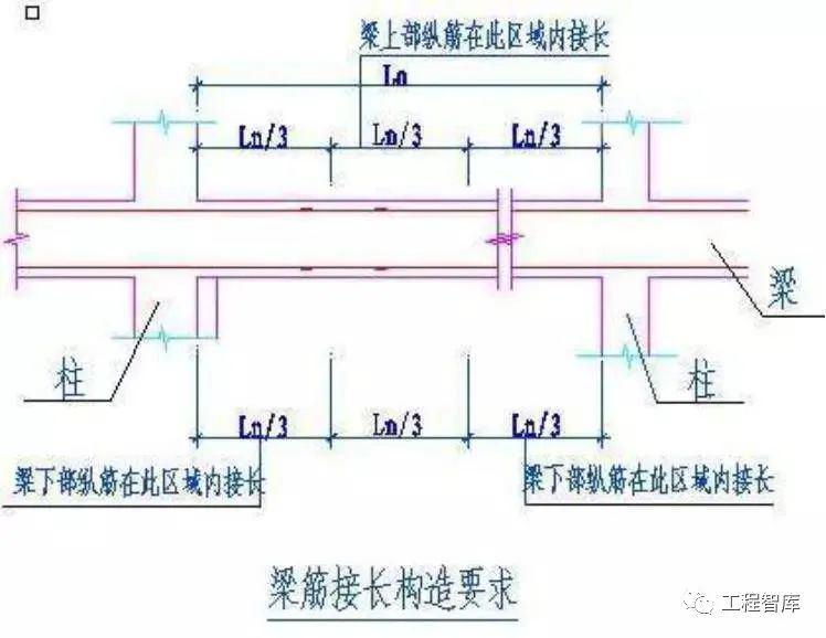 梁上部纵筋接长需在跨中Ln/3范围内,梁下部纵筋接长须在墙、柱支座处Ln/3范围内。