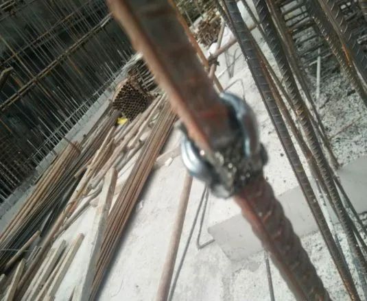 2、套柱箍筋:按图纸要求间距,计算好每根柱箍筋数量,先将箍筋套在下层伸出的搭接筋上,然后焊接柱子钢筋,箍筋的接头(弯钩叠合处)应交错布置在四角纵向钢筋上。