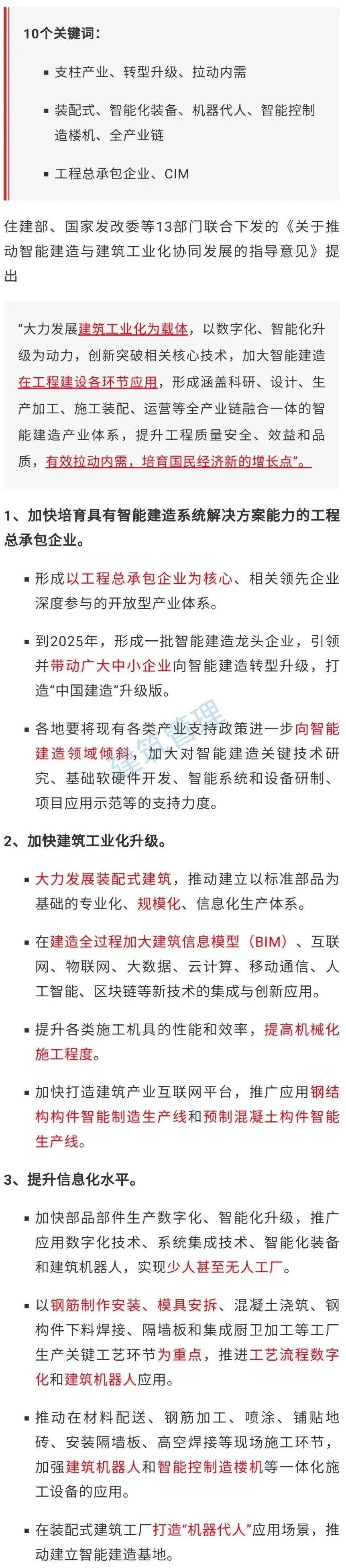到2025年,我国智能建造与建筑工业化协同发展的政策体系和产业体系基本建立,建筑工业化、数字化、智能化水平显著提高,建筑产业互联网平台初步建立,产业基础、技术装备、科技创新能力以及建筑安全质量水平全面提升,劳动生产率明显提高,能源资源消耗及污染排放大幅下降,环境保护效应显著。推动形成一批智能建造龙头企业,引领并带动广大中小企业向智能建造转型升级,打造“中国建造”升级版。