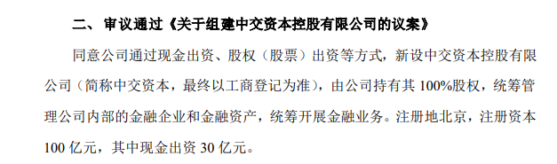 对于成立中交资本,在中国交建的公告中早已经披露。2021年7月12日,上市公司~中国交通建设股份有限公司召开第四届董事会第五十一次会议,审议通过《关于组建中交资本控股有限公司的议案》,新公司注册资本将达到100亿元,注册地位于北京。根据规划,中交资本将成为中国交建金融控股和资本服务平台,围绕“资金、资产和资本”三大核心要素,统筹开展产业金融和资本运作(截图如下)。