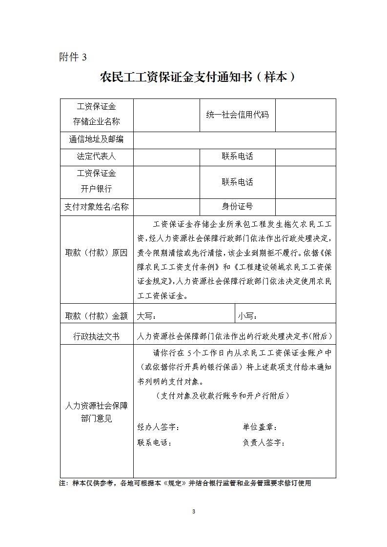第十九条 施工总承包单位所承包工程发生拖欠农民工工资的,经人力资源社会保障行政部门依法作出责令限期清偿或先行清偿的行政处理决定,施工总承包单位到期拒不履行的,属地人力资源社会保障行政部门可以向经办银行出具《农民工工资保证金支付通知书》(附件3,以下简称《支付通知书》),书面通知有关施工总承包单位和经办银行。经办银行应在收到《支付通知书》5个工作日内,从工资保证金账户中将相应数额的款项以银行转账方式支付给属地人力资源社会保障行政部门指定的被拖欠工资农民工本人。