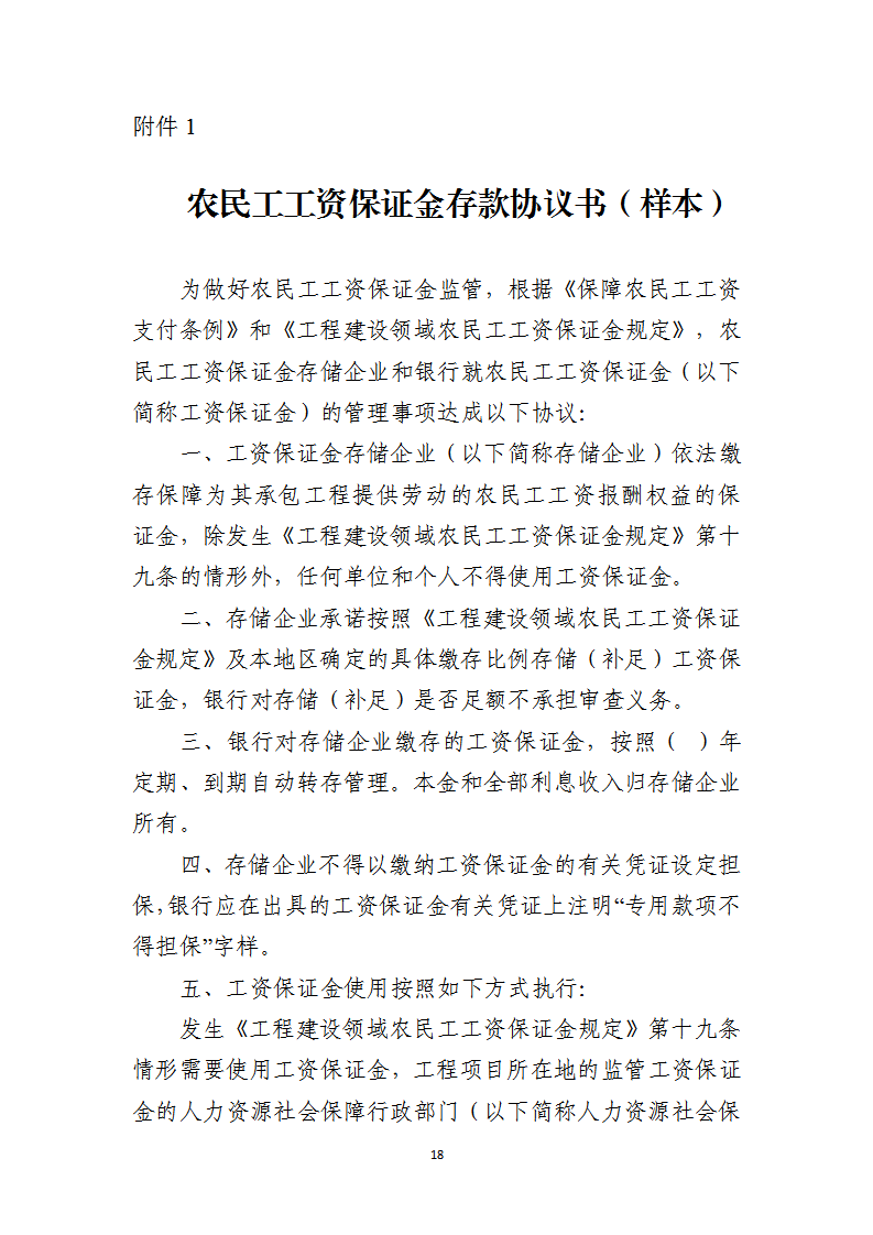 根据《保障农民工工资支付条例》授权,人力资源社会保障部、住房和城乡建设部、交通运输部、水利部、银保监会、铁路局、民航局制定了《工程建设领域农民工工资保证金规定》。现印发给你们,请贯彻执行。