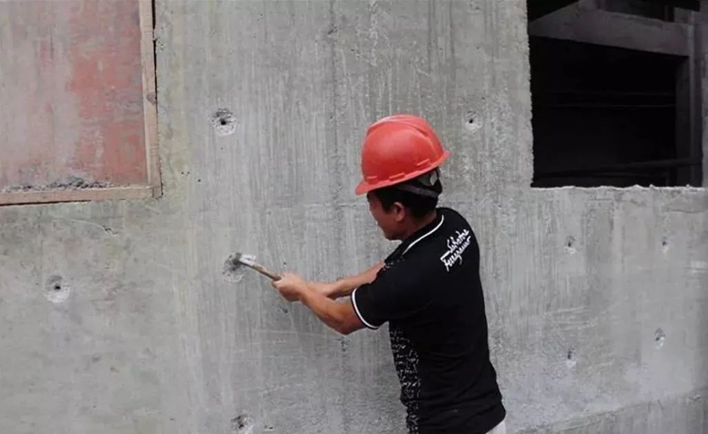 6、结构内墙面螺杆眼孔洞处理同外墙,先将螺杆眼凿出15mm深,直径30mm的喇叭形,灌1:3水泥砂浆。操作时,等先封堵的一头砂浆凝固后方可灌浆封堵另一头。