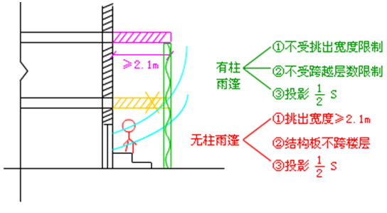 16、门廊应按其顶板的水平投影面积的1/2计算建筑面积;有柱雨篷应按其结构板水平投影面积的1/2计算建筑面积;无柱雨篷的结构外边线至外墙结构外边线的宽度在2.10m及以上的,应按雨篷结构板的水平投影面积的1/2计算建筑面积。