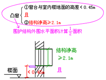 13、窗台与室内楼地面高差在0.45m以下且结构净高在2.10m及以上的凸(飘)窗,应按其围护结构外围水平面积计算1/2面积。