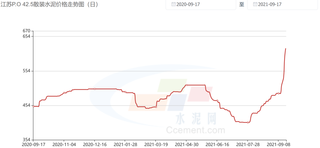 据中国水泥网数据显示,江苏地区水泥价格自7月底以来持续走高,进入9月更是直线上升,截至9月17日,江苏P.O42.5散装水泥均价在619.53元/吨,超去年同期168.6元/吨。