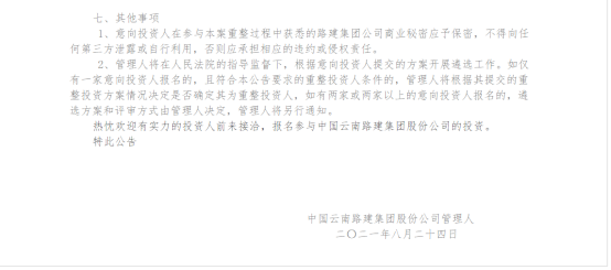 尽管云南路建集团8月13日才被裁定受理破产重整,但招募重整投资人节奏快,行动迅速,报名仅截至9月15日。