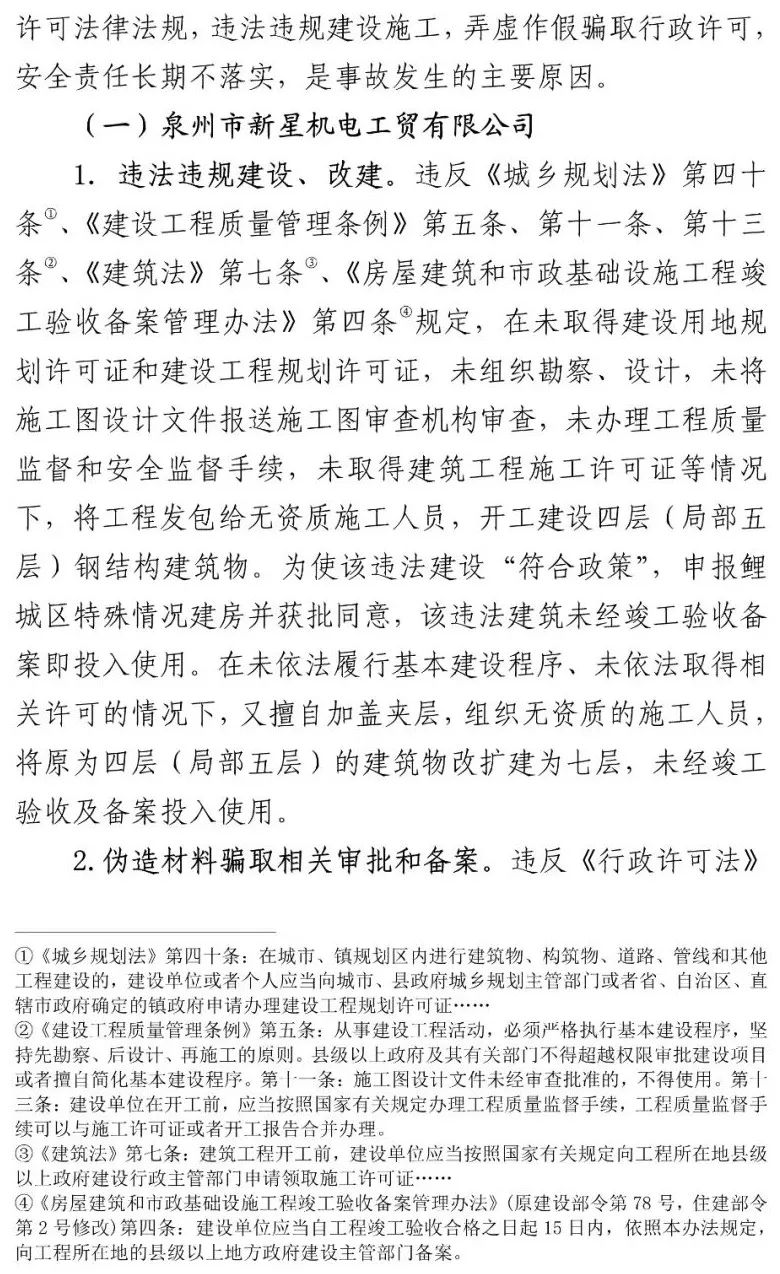 公安机关对泉州新星机电工贸公司法定代表人杨金锵、泉州广鑫建设工程公司法定代表人蔡条辉等23名相关责任人员,以涉嫌重大责任事故罪、伪造国家机关证件罪、提供虚假证明文件罪等依法立案侦查并采取刑事强制措施。