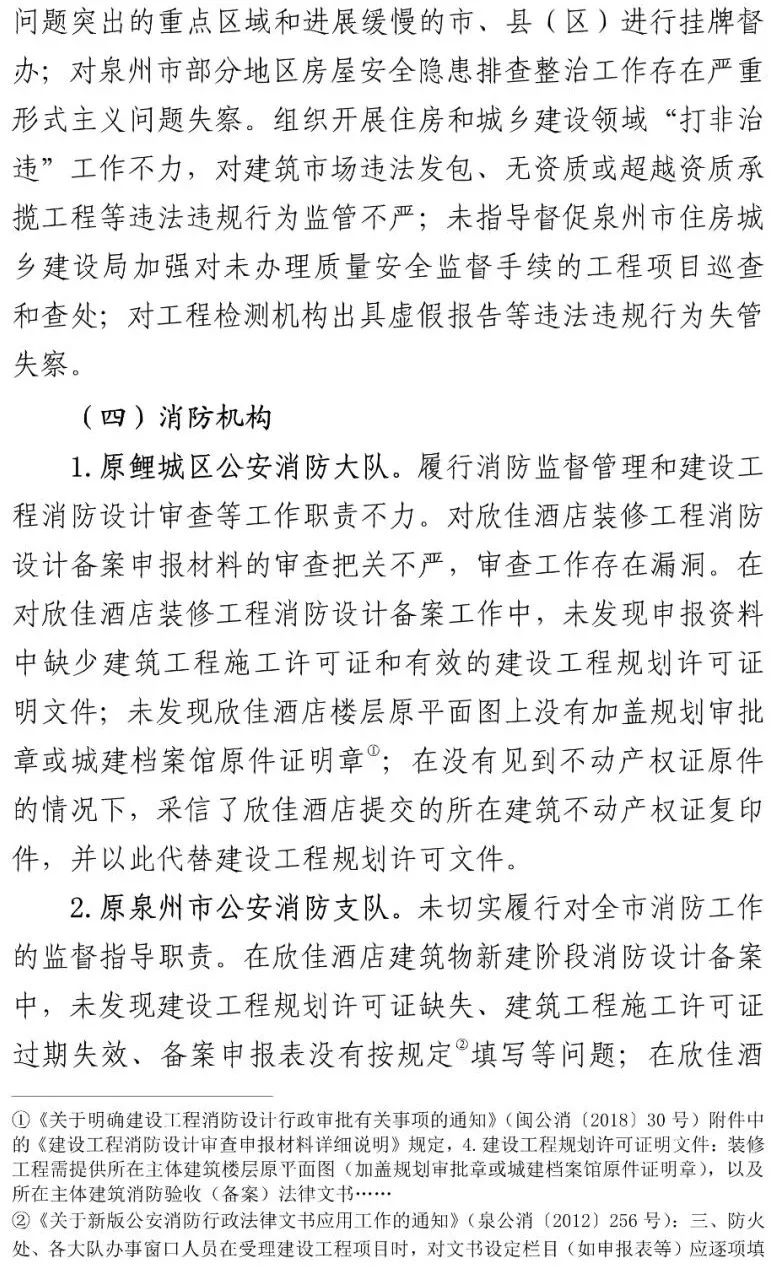 另查明,福建省建筑工程质量检测中心有限公司建筑物可靠性鉴定与抗震研究所承担检验职责的有关工作人员,在对欣佳酒店建筑物进行房屋质量检测时,明知存在安全隐患,仍违反技术标准要求,故意提供虚假证明文件,应承担相应刑事责任。李某生等2人在不具备相应资质的情况下,明知杨某锵未取得相关规划和建设手续,为欣佳酒店建筑物建设、夹层隔间、消防备案绘制建筑施工图纸,应承担相应刑事责任。泉州市公安局鲤城分局原副局长张某辉、泉州市消防救援支队应急通信与车辆勤务站原站长刘某礼、泉州市公安局鲤城分局治安大队一中队原指导员吴某晓等7名公职人员存在滥用职权、玩忽职守、受贿、徇私枉法、伪造国家机关证件等犯罪行为。