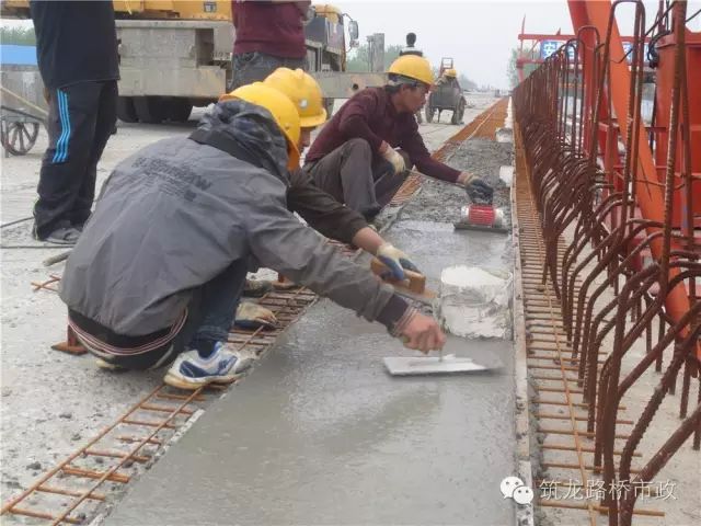 设立振捣梁轨道方式进行桥面铺装施工可做到无纵向施工缝,设置标高带方式进行桥面铺装施工单幅存在两条纵向施工缝。我部采用浇筑铺装混凝土前对此处进行再次洒水湿润,混凝土浇筑后采用细抹刀对纵向施工缝位置仔细进行二次修饰抹平。经采用标高带方式进行的首件铺装工程两条纵向接缝不明显,对铺装及其外观整体性产生的影响极小。