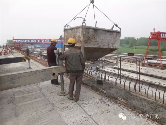 钢筋网绑扎锚固完毕后,测量人员对中线位置,标高带实际标高、标高带横纵坡进行复核,确认无误后即可浇注砼。砼施工前需先将标高带浇筑时残余的部分松散混凝土凿除,并将桥面板洒水润湿。其余要求同设立同设立振捣梁轨道方式进行。