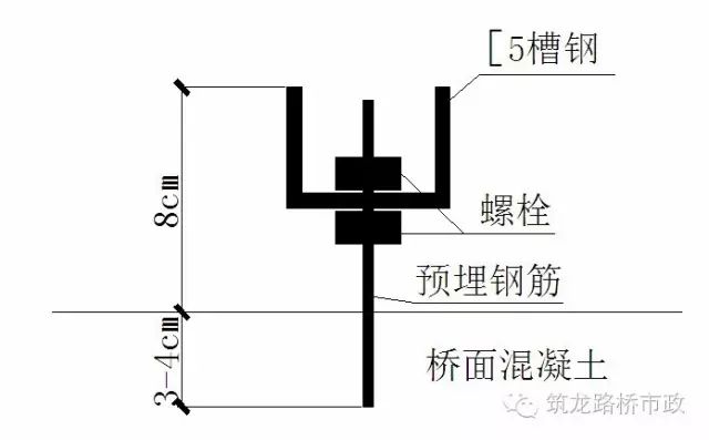 为保证振捣梁轨道具有足够的刚度和稳定性,轨道每0.5米布设一道支撑螺杆。支撑螺杆预埋结束后,严格按照测量班提供的高程数据调节下螺帽确定标高,轨道槽钢5按支撑螺杆开孔,铺设在螺帽上,其顶面高程既是桥面铺装砼的控制标高。