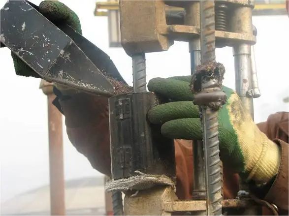 钢筋经专门的滚压机床对钢筋端部进行滚压,螺纹一次成型,然后利用扳手将两根钢筋的丝头拧进连接套筒。
