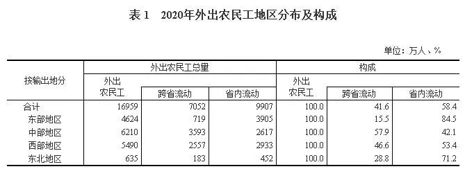 2020年,各地区各部门坚决贯彻党中央决策部署,统筹疫情防控和经济社会发展,有序推进复工复产,扎实做好“六稳”工作,全面落实“六保”任务,各项稳就业政策不断落实落地,国民经济持续稳定恢复,农民工就业保持总体稳定。2020年全国农民工总量28560万人,比上年减少517万人,下降1.8%,规模为上年的98.2%。其中,外出农民工16959万人,比上年减少466万人,下降2.7%;本地农民工11601万人,比上年减少51万人,下降0.4%。在外出农民工中,年末在城镇居住的进城农民工13101万人,比上年减少399万人,下降3.0%。在外出农民工中,跨省流动农民工7052万人,比上年减少456万人,下降6.1%;在省内就业的外出农民工9907万人,比上年减少10万人,与上年基本持平。省内就业农民工占外出农民工的比重为58.4%,比上年提高1.5个百分点。分区域看,东部、中部、西部和东北地区省内就业农民工占外出农民工的比重分别比上年提高1.6、1.3、1.8和1.0个百分点。(二)东部地区输出农民工人数减少最多,占到减少总量的一半以上从输出地看,东部地区输出农民工10124万人,比上年减少292万人,下降2.8%,占农民工总量的35.4%;中部地区输出农民工9447万人,比上年减少172万人,下降1.8%,占农民工总量的33.1%;西部地区输出农民工8034万人,比上年减少17万人,下降0.2%,占农民工总量的28.1%;东北地区输出农民工955万人,比上年减少36万人,下降3.6%,占农民工总量的3.3%。东部地区农民工减少量占到全国农民工减少总量的56.5%。(三)在东部地区务工人数减少最多,中西部地区吸纳就业的农民工继续增加从输入地看,在东部地区就业的农民工15132万人,比上年减少568万人,下降3.6%,占农民工总量的53%。其中,在京津冀地区就业的农民工2076万人,比上年减少132万人,下降6.0%;在江浙沪地区就业的农民工5179万人,比上年减少212万人,下降3.9%;在珠三角地区就业的农民工4223万人,比上年减少195万人,下降4.4%。在中部地区就业农民工6227万人,比上年增加4万人,与上年基本持平,占农民工总量的21.8%。在西部地区就业农民工6279万人,比上年增加106万人,增长1.7%,占农民工总量的22.0%。在东北地区就业农民工853万人,比上年减少42万人,下降4.7%,占农民工总量的3.0%。在全部农民工中,男性占65.2%,女性占34.8%。女性占比比上年下降0.3个百分点。其中,外出农民工中女性占30.1%,比上年下降0.6个百分点;本地农民工中女性占39.2%,下降0.2个百分点。在全部农民工中,未婚的占17.0%,有配偶的占79.9%,丧偶或离婚的占3.1%;有配偶的占比比上年下降0.3个百分点。其中,外出农民工有配偶的占68.1%,比上年下降0.7个百分点;本地农民工有配偶的占91.1%,下降0.2个百分点。农民工平均年龄为41.4岁,比上年提高0.6岁。从年龄结构看,40岁及以下农民工所占比重为49.4%,比上年下降1.2个百分点;50岁以上农民工所占比重为26.4%,比上年提高1.8个百分点,占比继续提高。从农民工的就业地看,本地农民工平均年龄46.1岁,其中40岁及以下所占比重为32.9%,50岁以上所占比重为38.1%;外出农民工平均年龄为36.6岁,其中40岁及以下所占比重为66.8%,50岁以上所占比重为14.2%。在全部农民工中,未上过学的占1%,小学文化程度占14.7%,初中文化程度占55.4%,高中文化程度占16.7%,大专及以上占12.2%。大专及以上文化程度农民工所占比重比上年提高1.1个百分点。在外出农民工中,大专及以上文化程度的占16.5%,比上年提高1.7个百分点;在本地农民工中,大专及以上文化程度的占8.1%,提高0.5个百分点。从事第三产业的农民工比重为51.5%,比上年提高0.5个百分点。其中,从事批发和零售业的农民工比重为12.2%,比上年提高0.2个百分点;从事住宿餐饮业的农民工比重均为6.5%,下降0.4个百分点。在第三产业其他行业中,从事卫生和社会工作,公共管理、社会保障和社会组织的比重有所增加。从事第二产业的农民工比重为48.1%,比上年下降0.5个百分点。其中,从事制造业的农民工比重为27.3%,比上年下降0.1个百分点;从事建筑业的农民工比重为18.3%,下降0.4个百分点。农民工月均收入4072元,比上年增加110元,增长2.8%。其中,外出农民工月均收入4549元,比上年增加122元,增长2.7%;本地农民工月均收入3606元,比上年增加106元,增长3.0%,增速快于外出农民工。分地区看,在各地区就业的农民工月均收入均有增长。其中,在东部地区就业的农民工月均收入4351元,比上年增加129元,增长3.1%;在中部地区就业的农民工月均收入3866元,比上年增加72元,增长1.9%;在西部地区就业的农民工月均收入3808元,比上年增加85元,增长2.3%;在东北地区就业的农民工月均收入3574元,比上年增加105元,增长3.0%。分行业看,农民工就业集中的六大主要行业月均收入继续增长。其中,从事制造业农民工月均收入4096元,比上年增加138元,增长3.5%;从事交通运输仓储和邮政业农民工月均收入4814元,比上年增加147元,增长3.1%;从事建筑业农民工月均收入4699元,比上年增加132元,增长2.9%;从事住宿餐饮业农民工月均收入3358元,比上年增加69元,增长2.1%;从事批发和零售业农民工月均收入3532元,比上年增加60元,增长1.7%;从事居民服务修理和其他服务业农民工月均收入3387元,比上年增加50元,增长1.5%。进城农民工人均居住面积21.5平方米,比上年提高1.1平方米,在不同规模城市的农民工人均居住面积均有增加。分城市规模看,农民工所在城市规模越小,人均居住面积越高。2020年,进城农民工在500万人以上城市居住的人均居住面