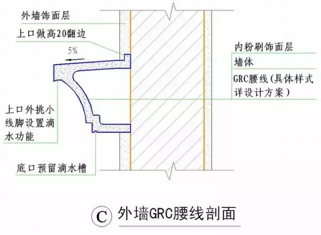 1)所有GRC装饰线必须保证上平面有坡度,下有滴水功能;