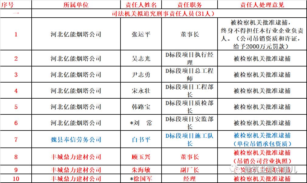 2017年9月15日,经国务院调查组公布调查结果,司法机关拟追究刑事责任人员31人,其中工程总承包方中南电力设计院3人、施工单位河北亿能公司6人、监理单位上海斯耐迪公司3人和魏县奉信劳务公司1人,其他人员18人。