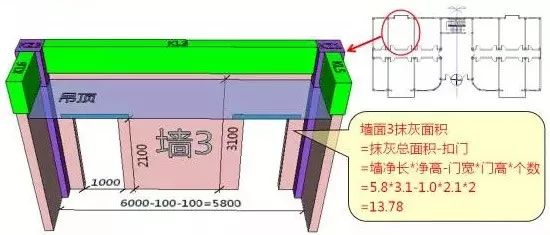 很显然,这里没有扣除踢脚所占面积,墙高只计算到吊顶底。