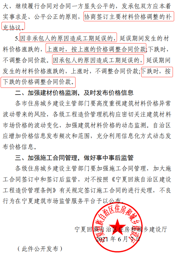 2021年6月15日,宁夏回族自治区住建厅发布关于加强建设工程材料价格风险管控的指导意见。