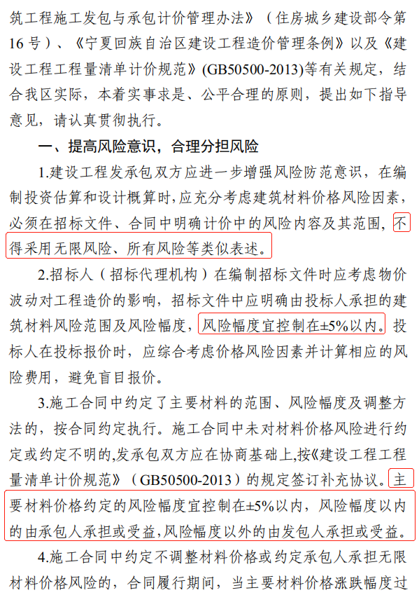 1.发承包双方应增强主要材料价格风险防范意识,充分考虑材料价格波动对工程造价、工程质量、施工安全的影响,施工合同必须明确约定主要建筑材料价格风险控制条款,不得采用无限风险、全部风险规定合同条款中的材料价格风险内容和范围。主要材料的种类由发承包双方在合同约定,主要材料价格约定的风险幅度应控制在5%以内。