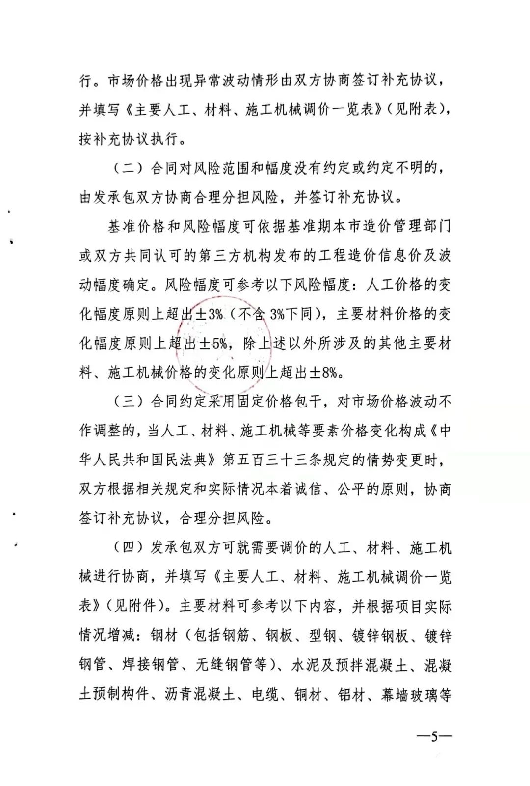 1.发承包双方应增强主要材料价格风险防范意识,充分考虑材料价格波动对工程造价、工程质量、施工安全的影响,施工合同必须明确约定主要建筑材料价格风险控制条款,不得采用无限风险、全部风险规定合同条款中的材料价格风险内容和范围。主要材料的种类由发承包双方在合同约定,主要材料价格约定的风险幅度应控制在5%以内。