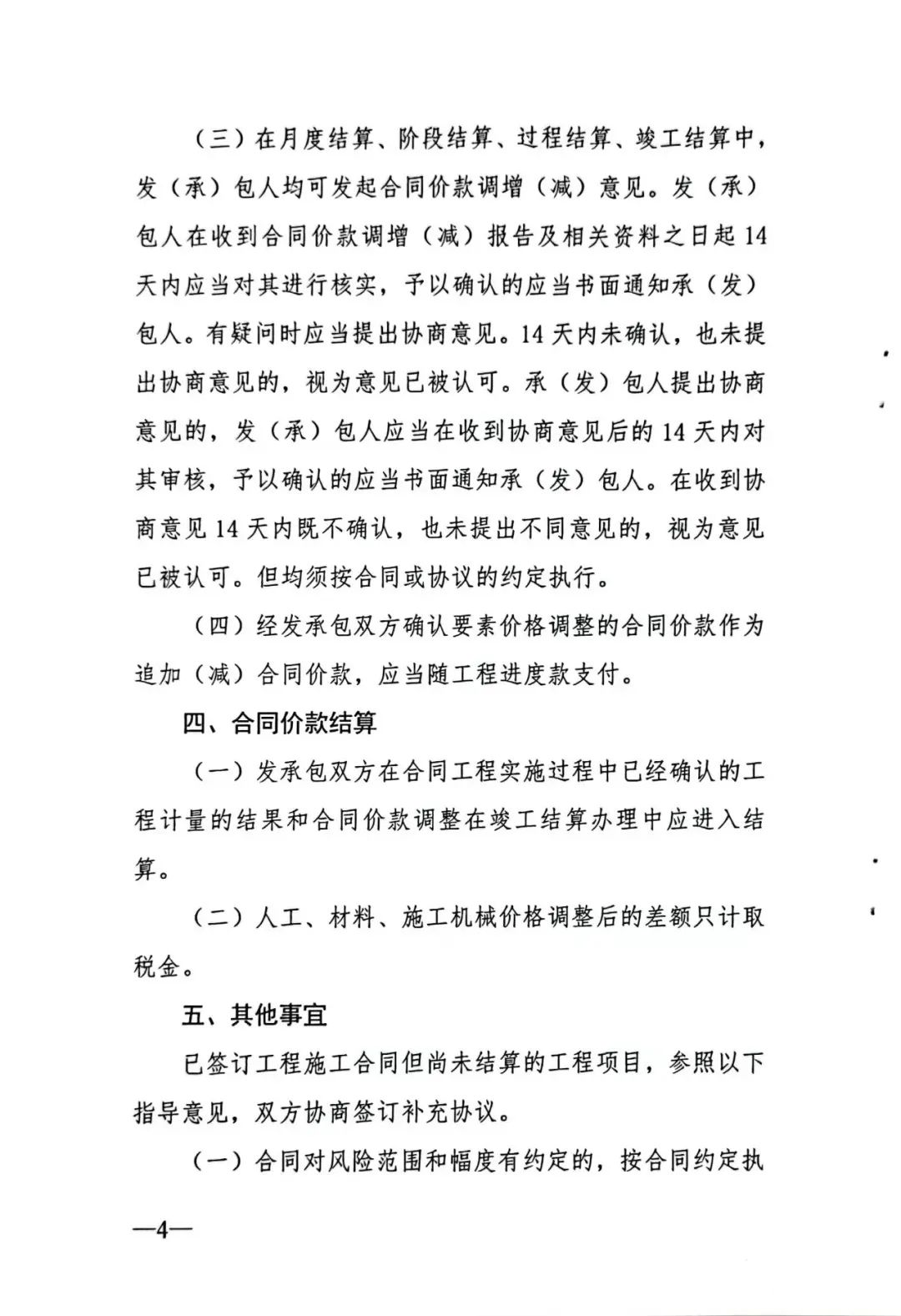 4.施工合同中约定不调整材料价格或约定承包人承担无限材料价格风险的,合同履行期间,当主要材料价格的涨跌幅度过大,继续履行合同对合同一方显失公平的,发承包双方应本着实事求是和公平公正的原则,协商签订主要材料价格调整的补充协议。
