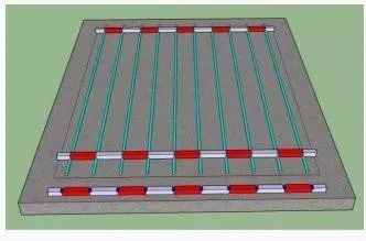 5.1 钢筋放线。筏板钢筋开始绑扎之前,基础轴线弹线完成,基础放线工作必须验收完毕,筏板钢筋位置线已弹好,特别在柱插筋位置、墙边线、基础梁、集水坑等位置线,应用红色油漆在墨线边及交角位置画出不小于 50mm宽,150mm 长标记,对于超厚筏板,在上层钢筋绑完后,应由放线组用油漆二次确认插筋位置线,如图 9-13 所示放线标记样式。