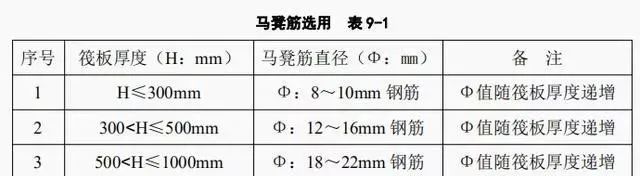 5.5 马凳筋选用。根据不同基础筏板厚度,马凳筋应采用不同直径的钢筋来进行加工制作,具体选用按表 9-1 所示。
