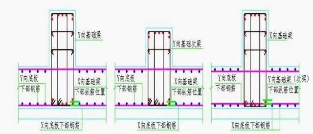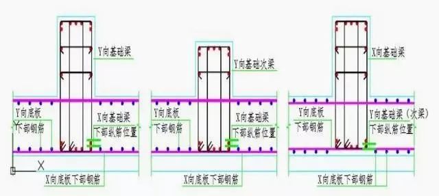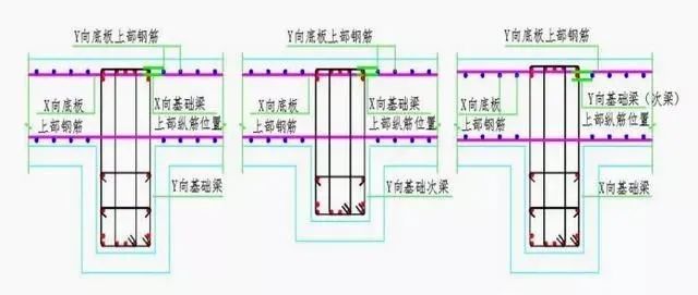 注意:施工高板位筏板时,梁钢筋与筏板下层钢筋以及梁与梁钢筋之间的位置关系。按图 9-7、图 9-8、图 9-9、图 9-10 所示绑扎。