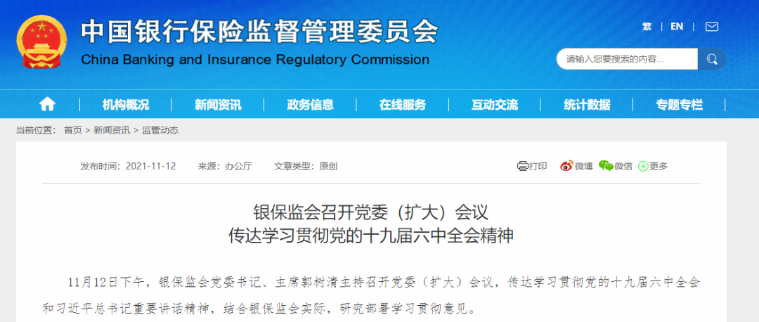 11月12日下午,银保监会党委书记、主席郭树清主持召开党委(扩大)会议,传达学习贯彻党的十九届六中全会和习近平总书记重要讲话精神,结合银保监会实际,研究部署学习贯彻意见。