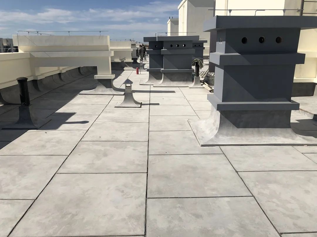 主楼屋面排气管道:主楼出屋面烟风道、风井四周分缝按参照女儿墙与刚性屋面连接分缝施工。出屋面管道防水施工至刚性防水保护层上部250mm高。卷材与出屋面管道热熔密封。