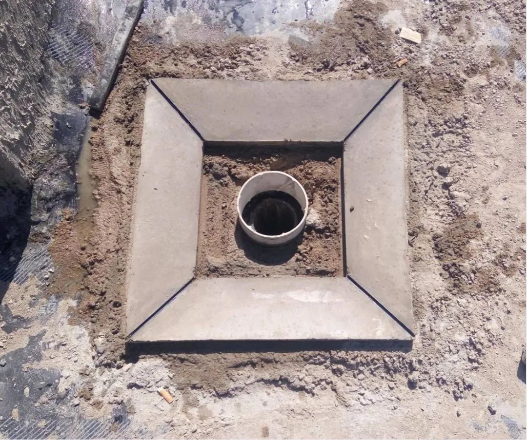 主楼屋面水落口:出屋面的雨水口在屋面防水保护层施工时候,此区域500范围内的刚性防水保护层提前施工,此区域内500范围内四周提前预埋定型化模板框(定型化模板块采用模板条制作)。使雨水口500*500区域刚性保护层与四周分开,此区域内找坡坡度按5%施工,其余区域找坡按2%向雨水口找坡施工。