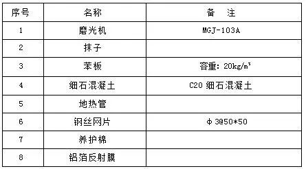 工艺原理:借鉴墙面分层抹灰施工工艺,将传统的一次成型浇筑施工更改为分层浇筑施工;分层浇筑混凝土地热地面是指在地热采暖管铺设完毕后先进行第一次混凝土垫层浇筑,浇筑标高控制在地热管上皮标高,然后用刮杠平地热管上皮刮平,振捣密实;待垫层混凝土达到初凝后便可以进行第二次混凝土面层浇筑,面层浇筑厚度≥30mm;
