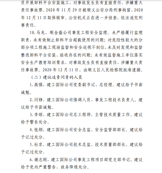 1、建工国际公司,对事故发生负有主要责任。给予其52万元罚款的行政处罚,纳入联合惩戒对象管理;暂扣其安全生产许可证90日,一年内对其资质升级申请和增项申请不予批准。