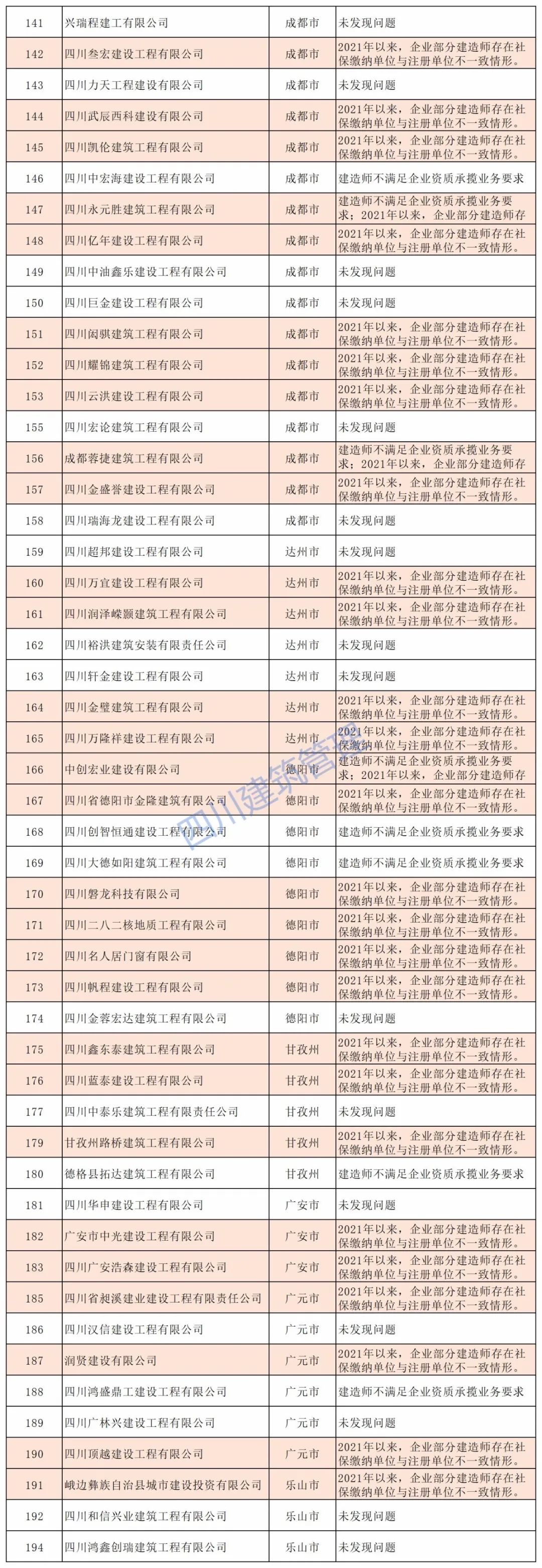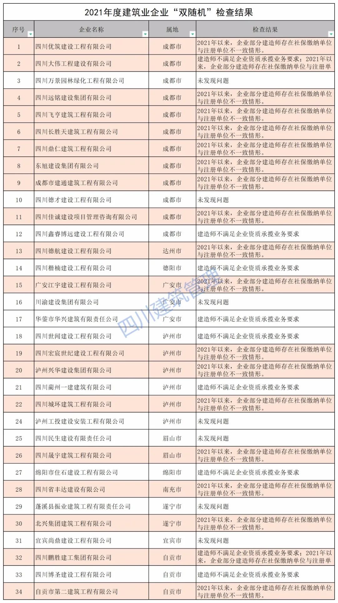 11月17日,四川省住建厅对2021年度建筑业企业“双随机”检查结果公示。