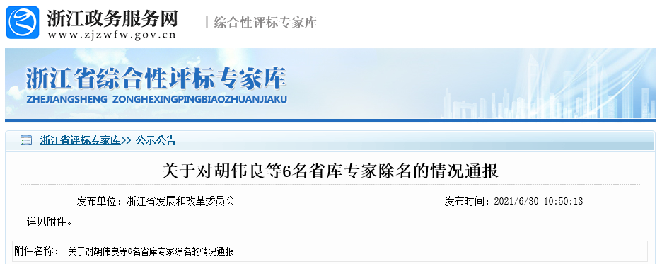 近日,浙江省综合性评标专家库发布《关于对胡伟良等6名省库专家除名的情况通报》。
