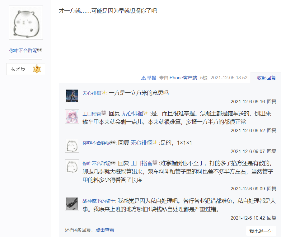 某公司施工员晚上加班打混凝土打到十一点半,因为施工结束多剩下一方混凝土没有合理处置,直接让商砼站拉回去。被人举报到公司后,公司非常严肃得对待此事件,直接发红头文件。