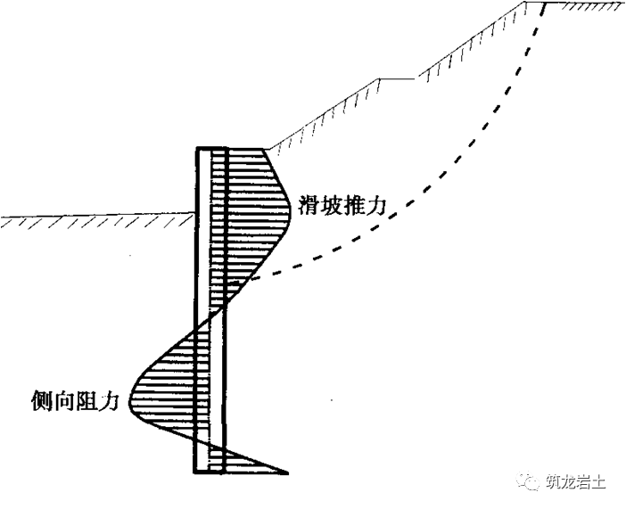 桩是深入土层或岩层的柱形构件。边坡处治工程中的抗滑桩是通过桩身将上部承受的坡体推力传给桩下部的侧向土体或岩体,依靠桩下部的侧向阻力来承担边坡的下推力,而使边坡保持平衡或稳定,见图1。