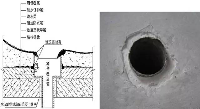 管根与混凝土(水泥砂浆)之间应留凹槽,槽深10mm、宽20mm,槽内嵌填密封膏;蹲便器底部与立管相接处应加设密封膏。