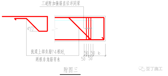 2、主次梁交接处未特别注明者均按照附图二要求配置附加横向钢筋: