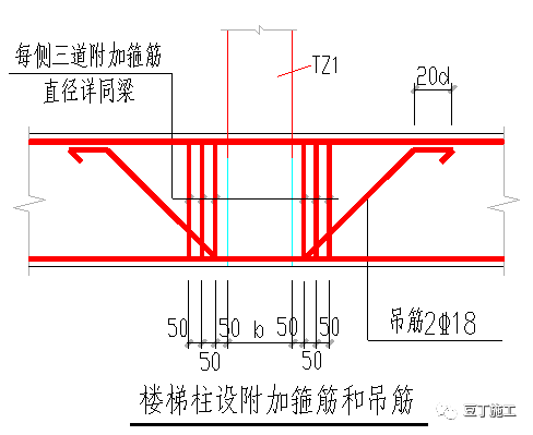 4)楼梯柱设附加箍筋和吊筋: