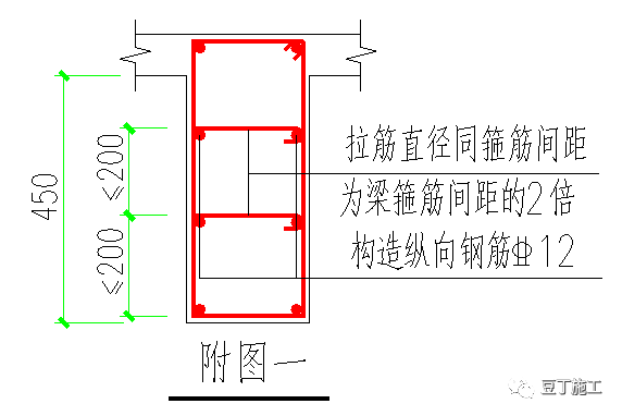 1、当梁的腹板高度≥450mm时,在梁的两个侧面应沿高度配置纵向构造钢筋,其间距≤200mm;梁的两个侧面纵向构造钢筋除各设计图纸已注明者外其余均按照附图一配置: