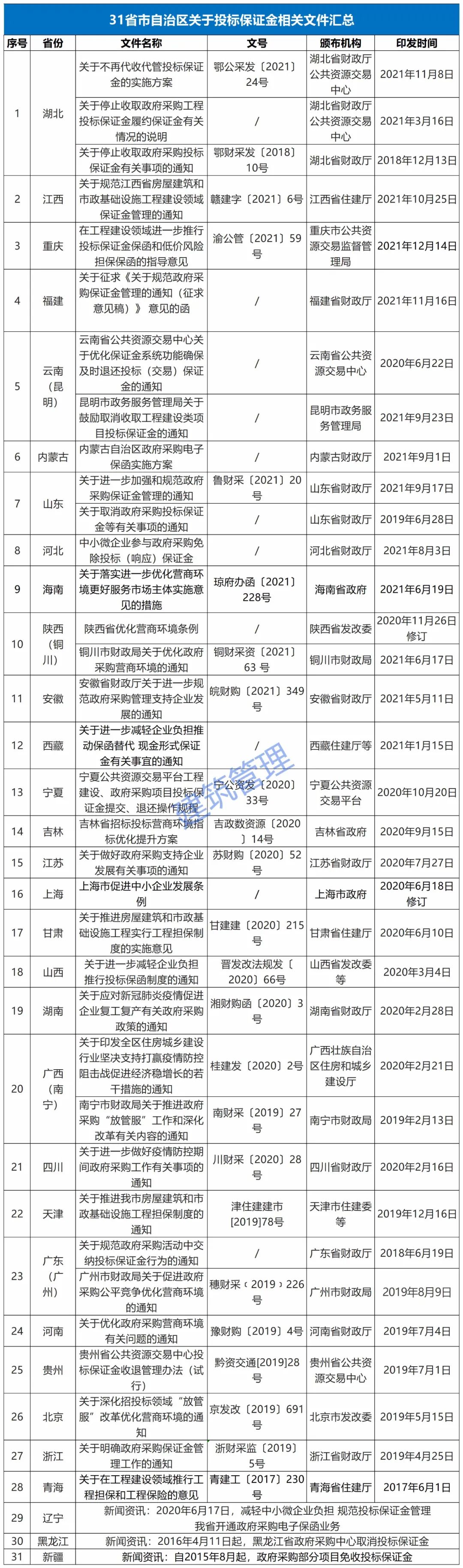 2021年3月,湖北省公共资源交易中心印发通知,要求停止收取政采工程投标保证金、履约保证金。