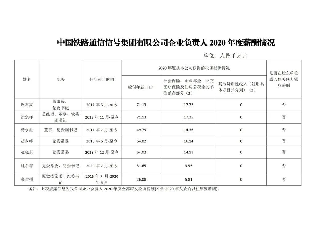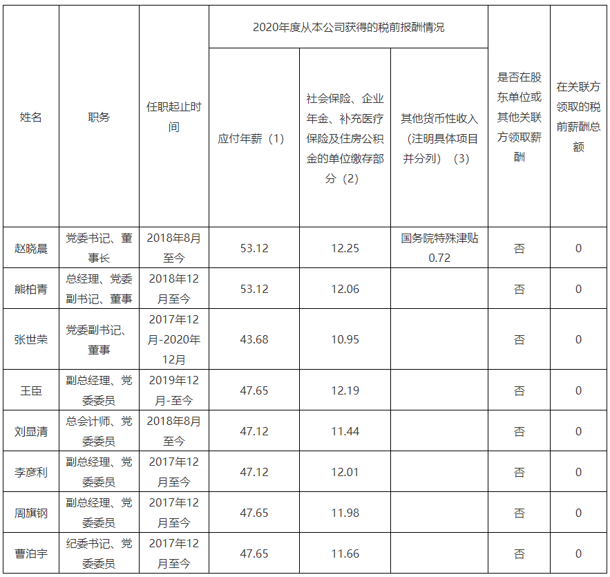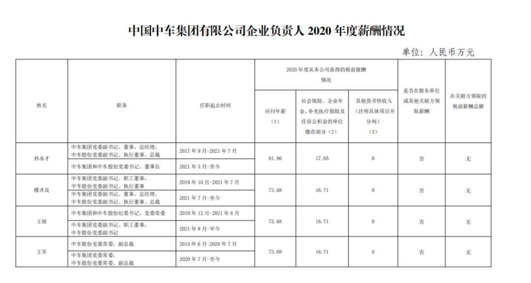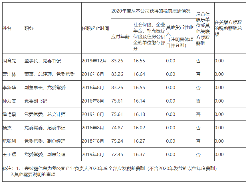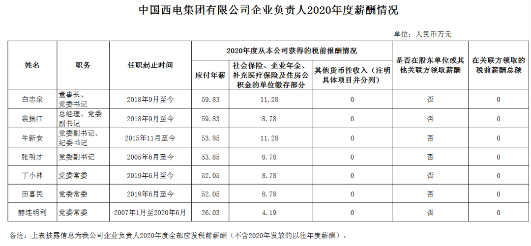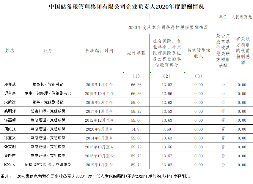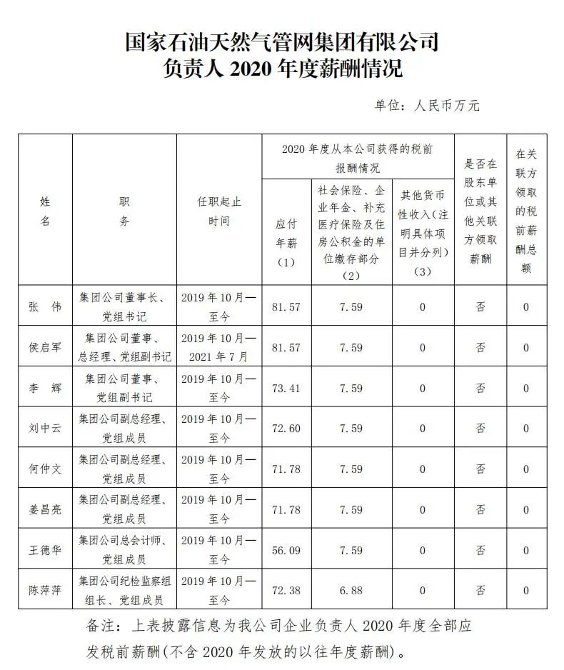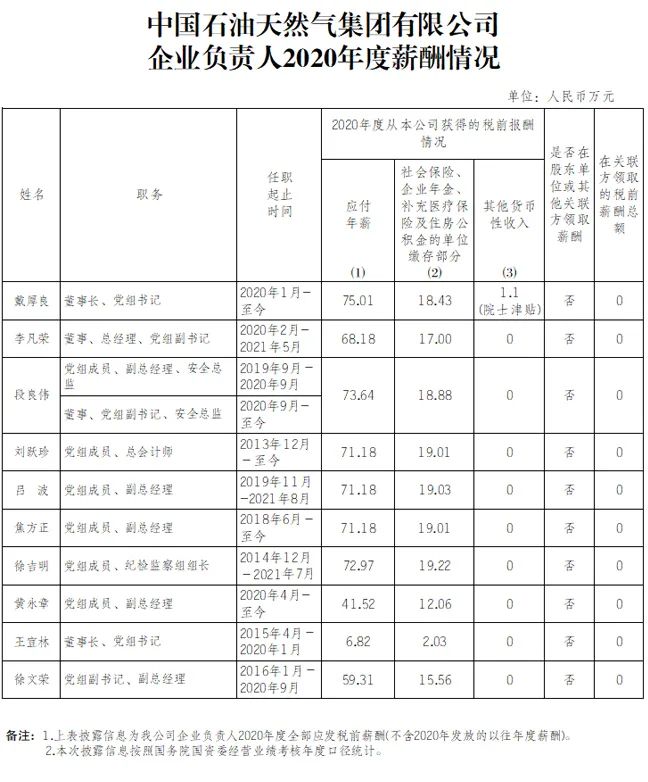 注:如有中央企业一把手在2020年内发生人事变更,该表优先选取2020年内在职时间较长人员。如需了解各中央企业所有负责人2020年度薪酬情况请在下方查看。