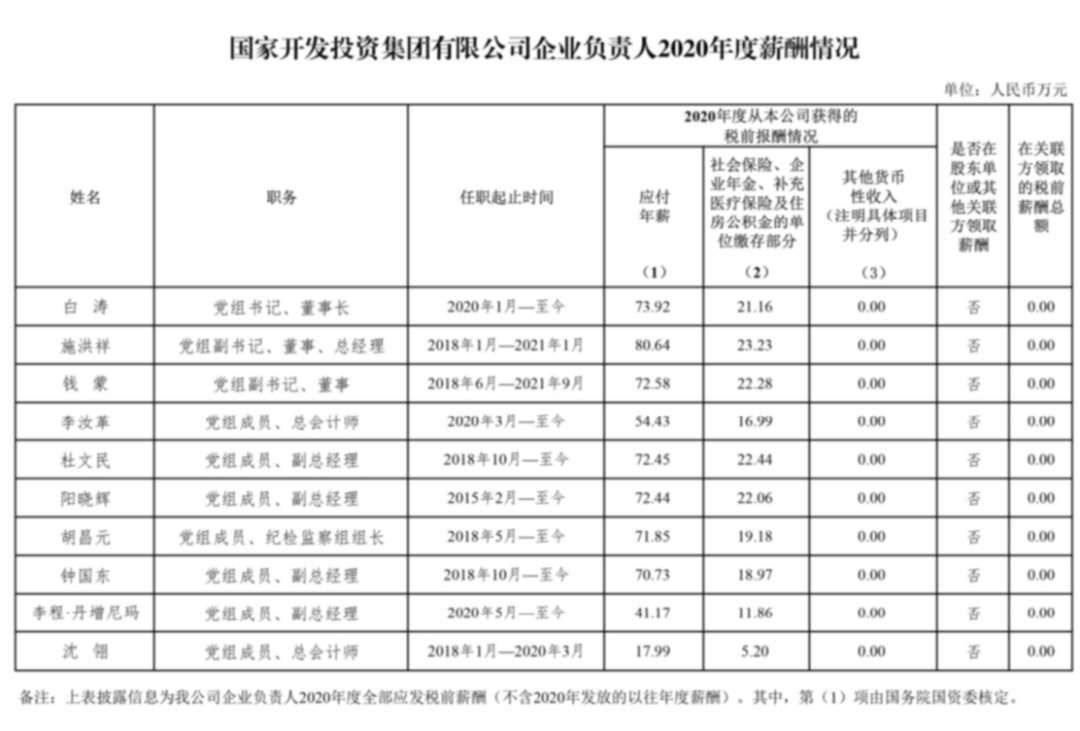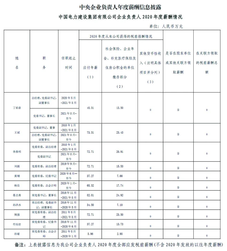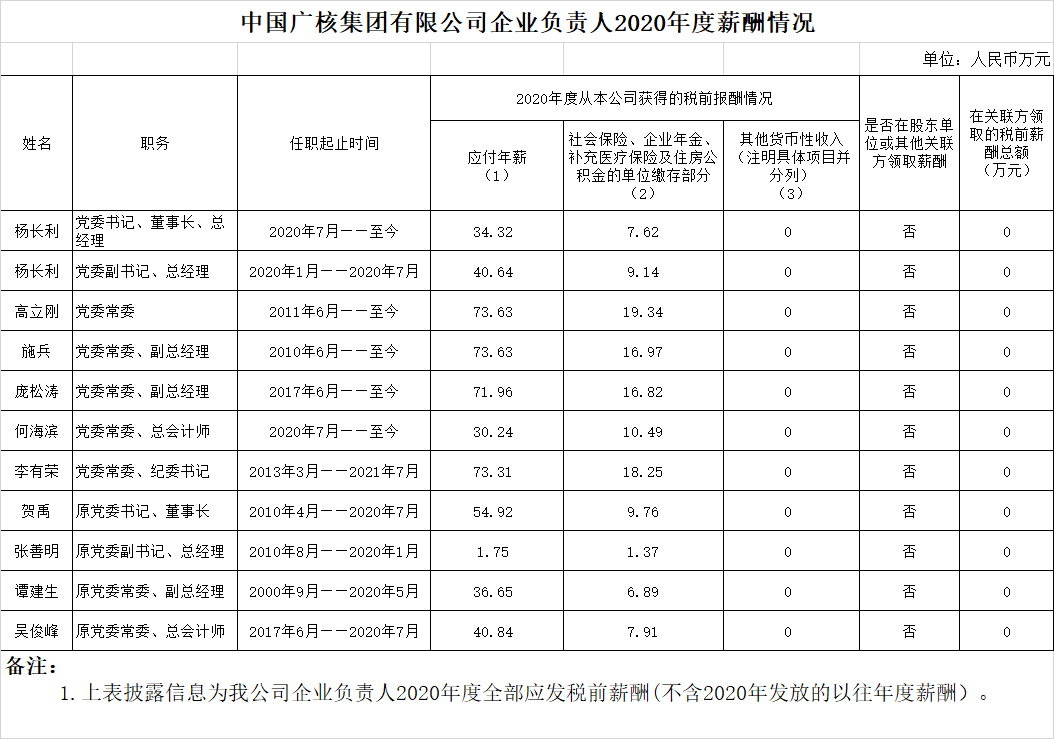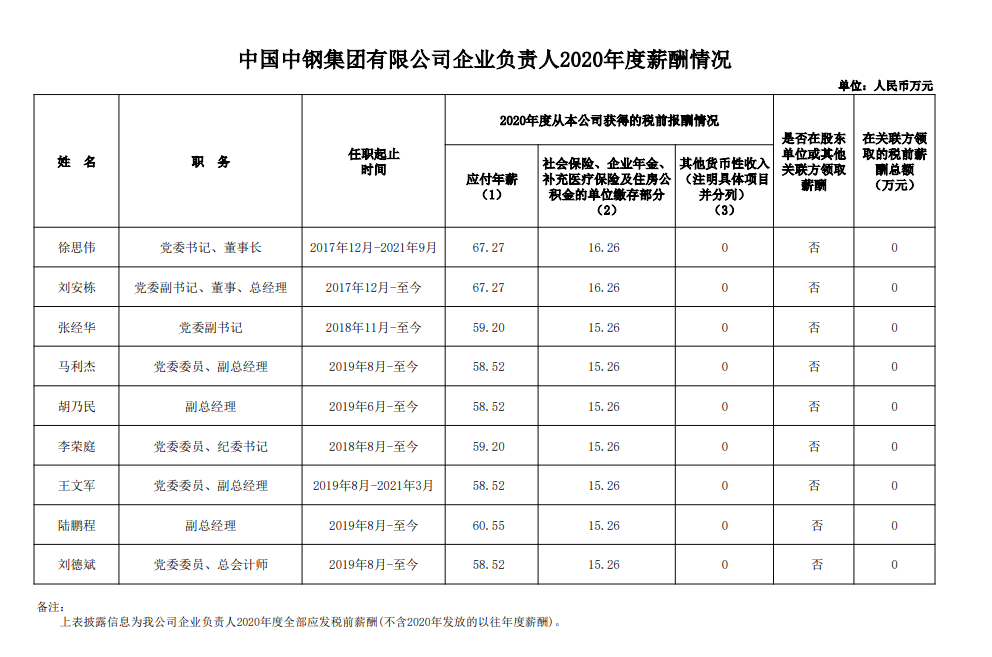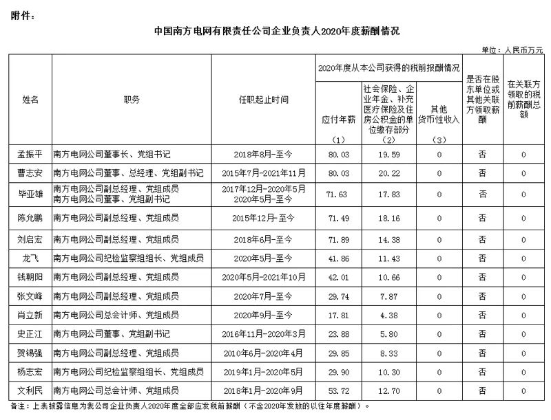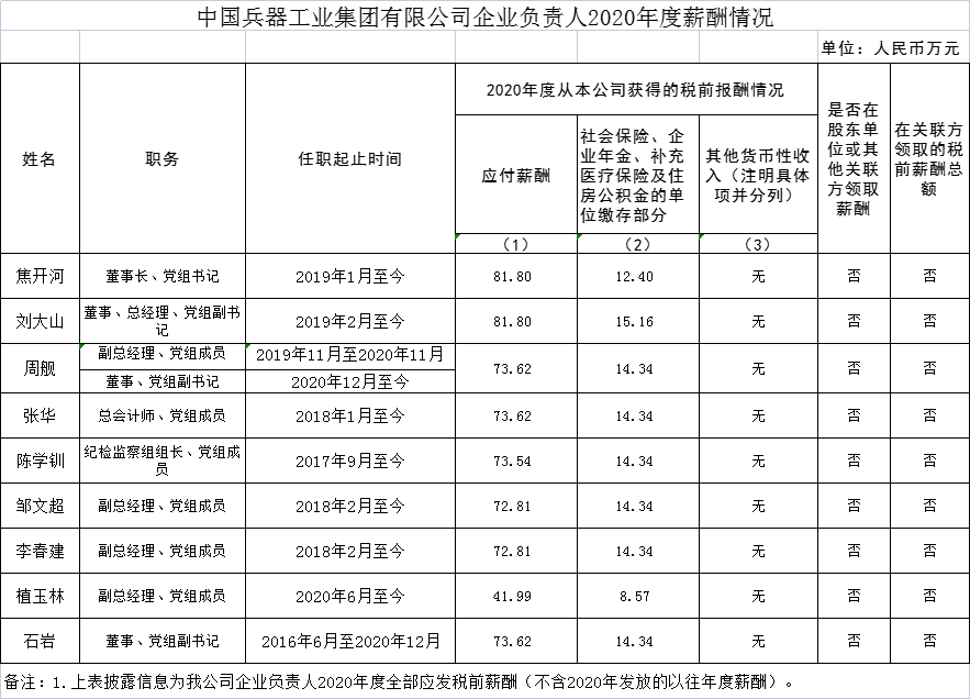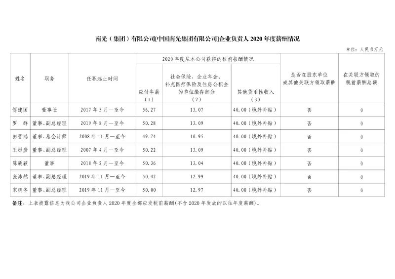 注:如有中央企业一把手在2020年内发生人事变更,该表优先选取2020年内在职时间较长人员。如需了解各中央企业所有负责人2020年度薪酬情况请在下方查看。