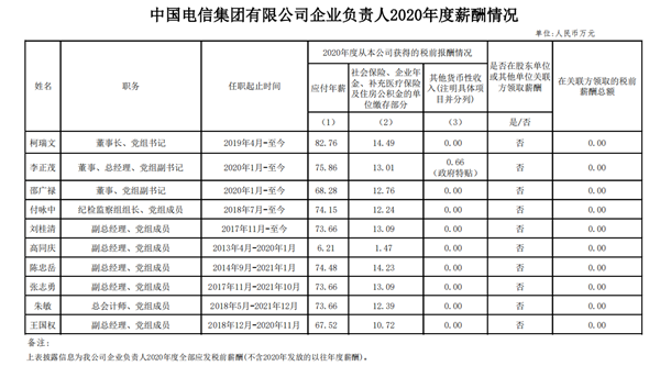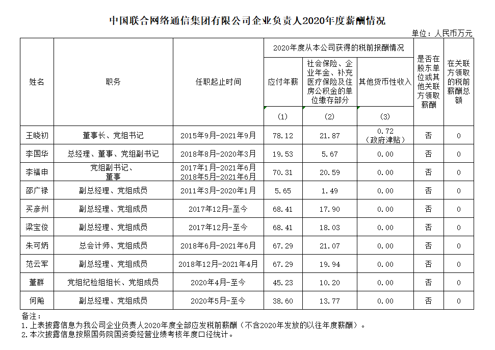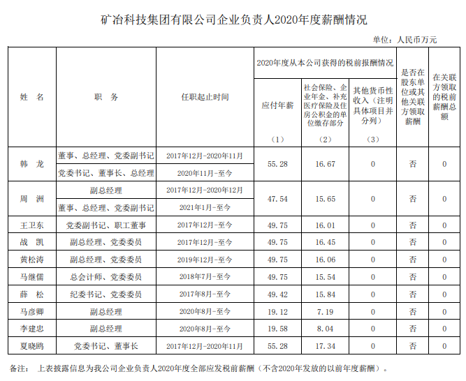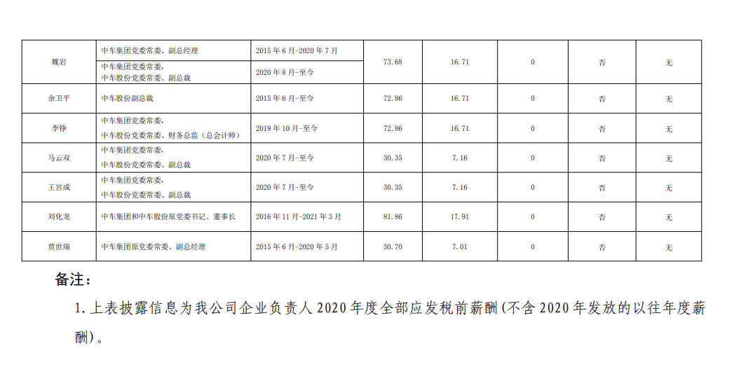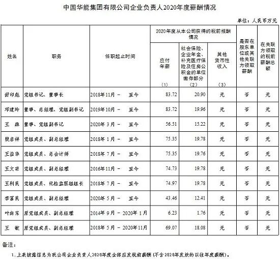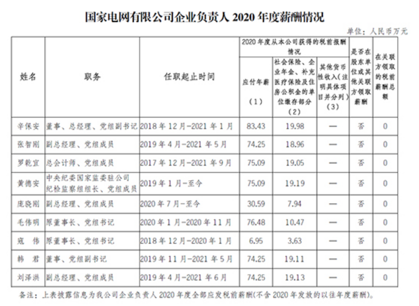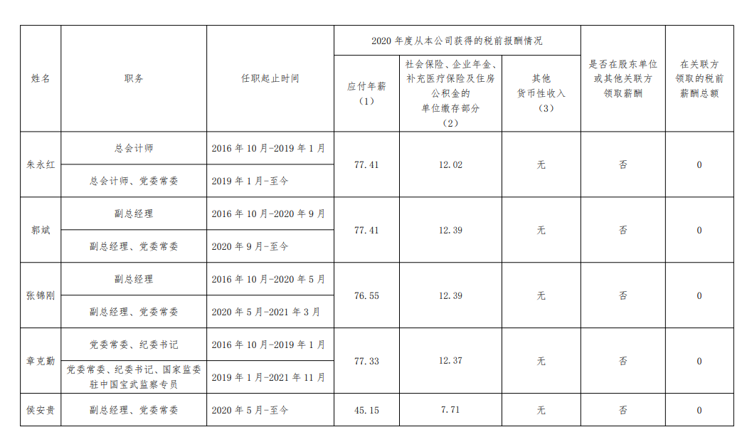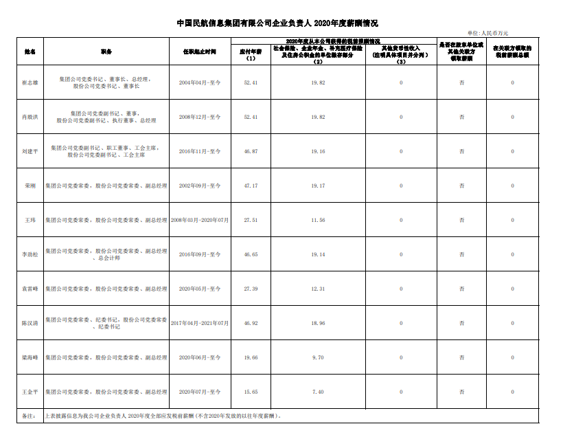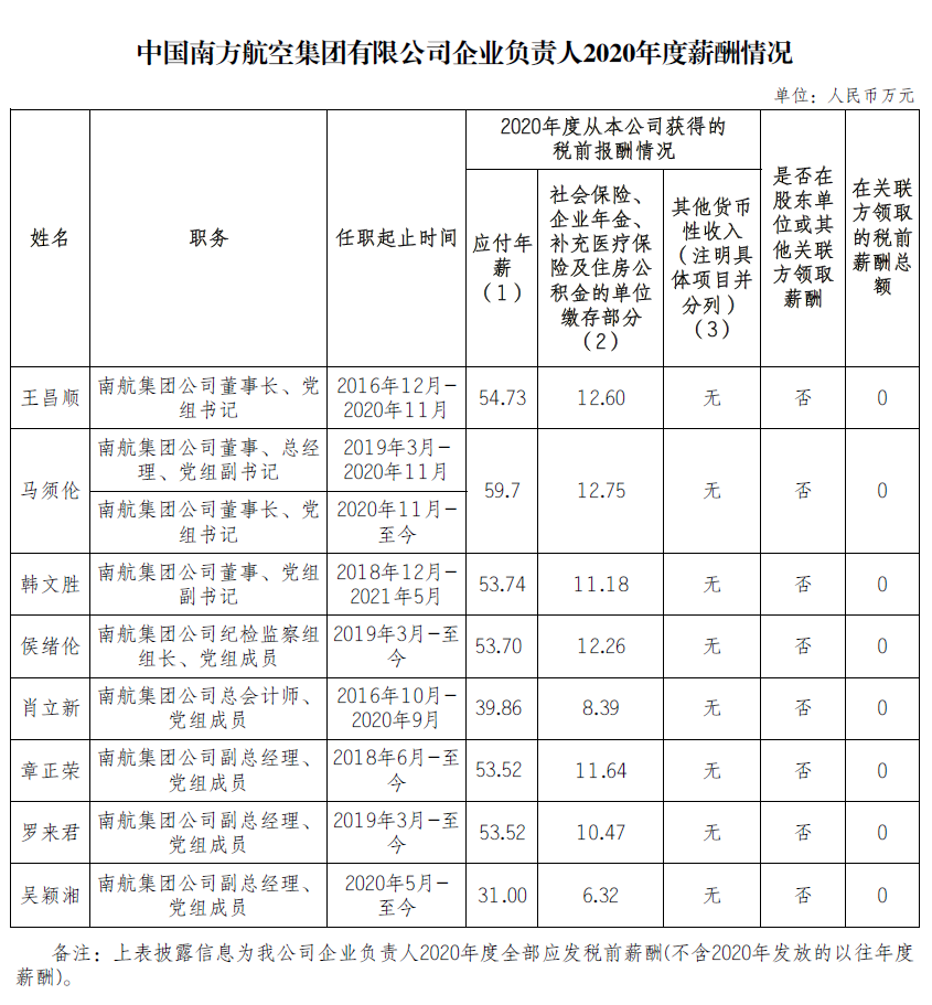 注:如有中央企业一把手在2020年内发生人事变更,该表优先选取2020年内在职时间较长人员。如需了解各中央企业所有负责人2020年度薪酬情况请在下方查看。