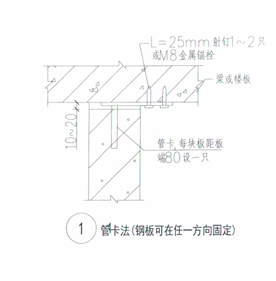 4)隔墙板转角或T型连接应用φ6销钉固定。销钉位置宜距隔墙顶和底各300~400。销钉间距为700左右。销钉锚入两块不同方向板材的总深度不得小于一块板厚再加150mm。