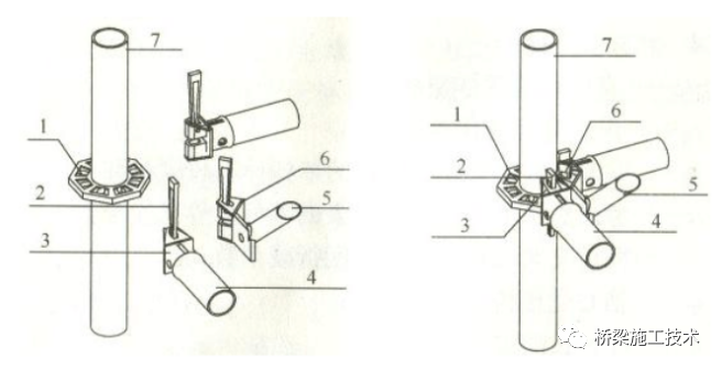 1—连接盘;2—插销;3—水平杆杆端扣接头;4—水平杆;5—斜杆;6-斜杆杆端扣接头;7—立杆