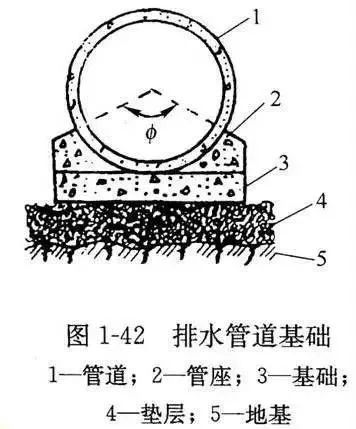 沿管道全长铺设带状水泥混凝土,适用于各种土质,特别是土壤条件差、震区、重要管道等。按管座的形式,分为90度、135度、180度、360度四种管座基础,根据管道埋置深度选择。功能:便于对管道衔接以及定期检查和疏通。